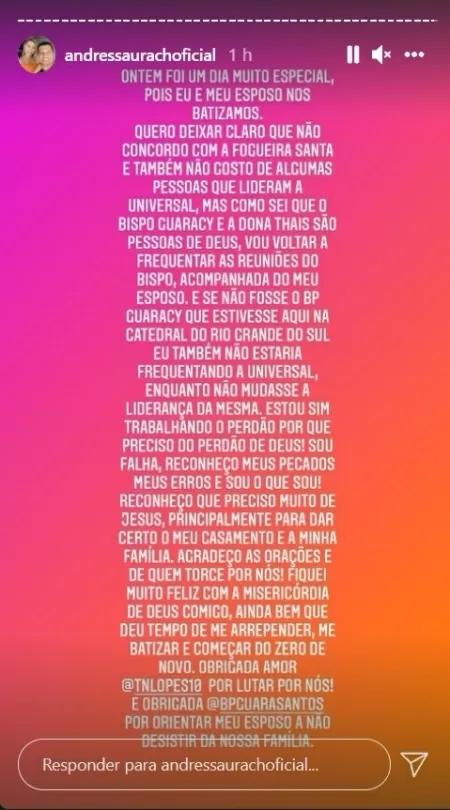 “Ontem foi um dia muito especial, pois eu e meu esposo nos batizamos. Quero deixar claro que não concordo com a fogueira santa e também não gosto de algumas pessoas que lideram a Universal, mas como sei que o Bispo Guaracy e a dona Thais são pessoas de Deus, vou voltar a frequentar as reuniões do bispo, acompanhada do meu esposo. E se não fosse o bispo Guaracy que estivesse aqui na catedral do Rio Grande do Sul, eu também não estaria frequentando a Universal, enquanto não mudasse a liderança da mesma”, escreveu Urach em uma parte de sua mensagem nos Stories de seu perfil no Instagram.