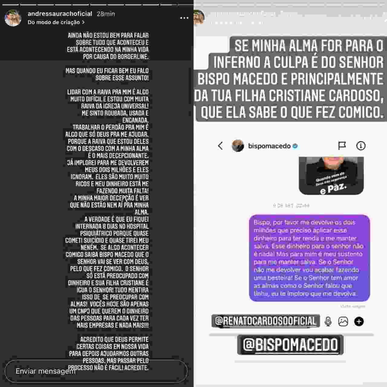 Nesta quinta-feira (23), a ex- Universal Andressa Urach usou as redes sociais para criticar a cúpula da Igreja Universal do Reino de Deus.