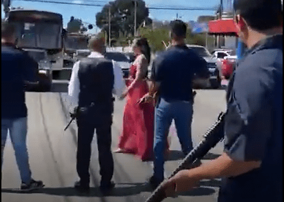 Homens armados param trânsito para ‘dama de vermelho’ atravessar rua e vídeo repercute nas redes sociais