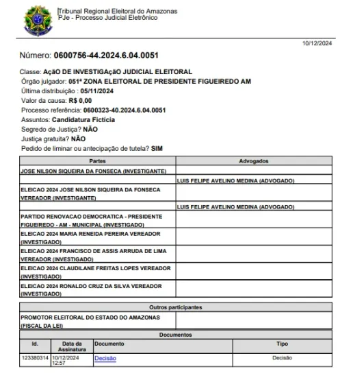 A Justiça Eleitoral de Presidente Figueiredo decidiu, de forma preventiva, pela cassação da diplomação dos vereadores eleitos Ronaldo Limão (PRD) e Assis Arruda (PRD). Ambos faziam parte da coligação que apoiou a ex-prefeita Patrícia Lopes, derrotada nas últimas eleições municipais. Além disso, Mariane (UB) é outra parlamentar que pode perder seu mandato em decorrência da retotalização dos votos.