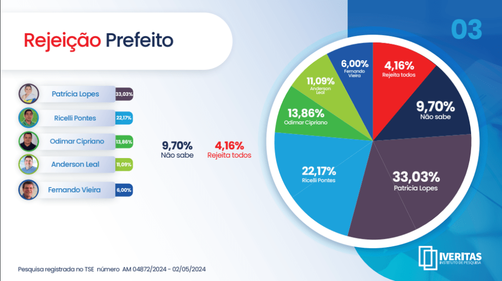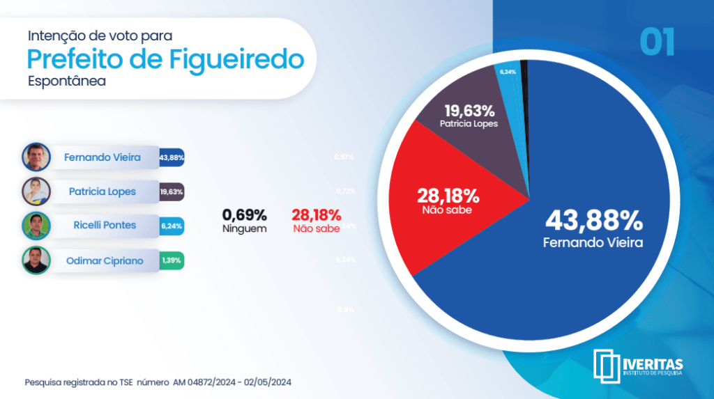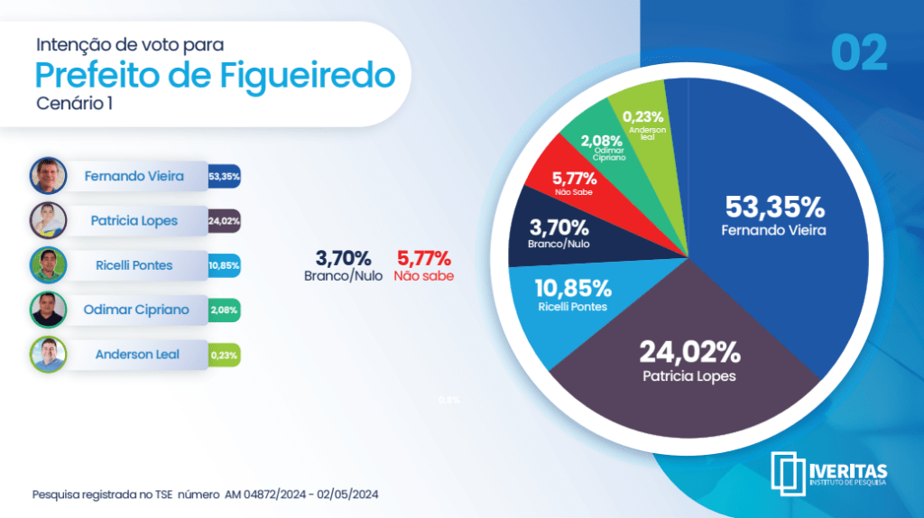 Nesta quarta-feira (08), o Iveritas Instituto divulgou os resultados de uma pesquisa registrada no Tribunal Superior Eleitoral (TSE) sob o número 04872/2024, focando na intenção de voto para prefeito de Presidente Figueiredo.