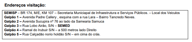 Os bens móveis inservíveis poderão ser visitados nos dias 24 a 26 de abril, no horário de 08:00hs às 12:00hs e de 14:00hs às 17:00hs. As visitas ocorrerão nos endereços apresentados durante a inscrição.
