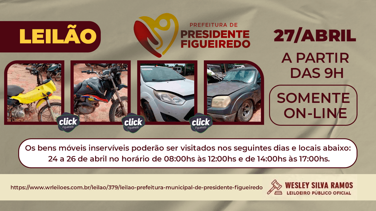 A Prefeitura de Presidente Figueiredo, por meio da Secretaria Municipal de Administração, anunciou a realização do 1º Leilão Público de bens móveis inservíveis pertencentes ao Acervo Patrimonial do município. O leilão será conduzido pelo Leiloeiro Público Oficial Sr. Wesley Silva Ramos, matrícula JUCEA n.º011/09, e ocorrerá no dia 27 de Abril de 2023, a partir das 9:00 horas, exclusivamente on-line no endereço www.wrleiloes.com.br.