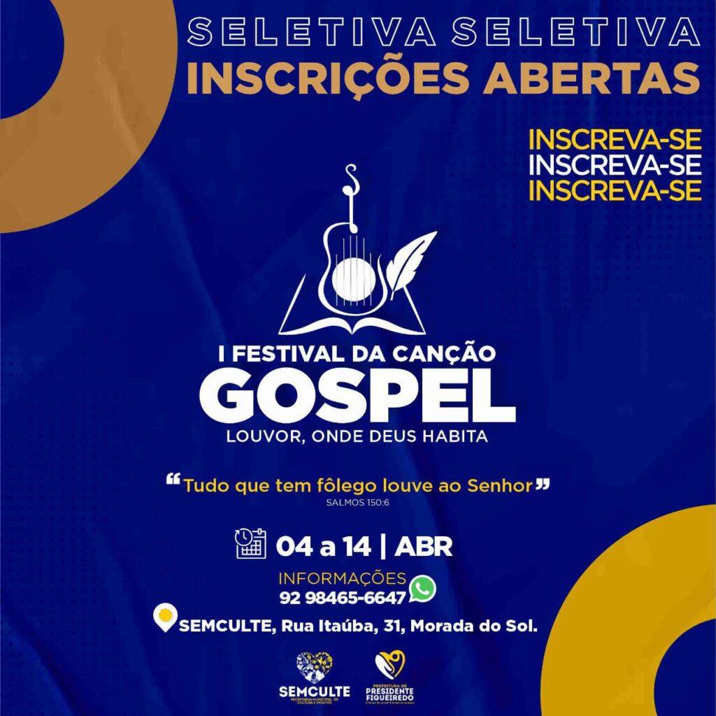 A Secretaria Municipal de Cultura e Eventos (SEMCULTE) da Prefeitura de Presidente Figueiredo está organizando o I Festival da Canção Gospel com o objetivo de valorizar a música gospel no município e incentivar novos talentos. O festival está aberto para cantores e compositores gospel residentes em Presidente Figueiredo, e as inscrições podem ser feitas até o dia 14 de abril de 2023, gratuitamente e através do link [https://docs.google.com/forms/d/e/1FAIpQLSfrXRw4Y4UNpy0vHJWriXaNZCOjJAJKlJCfo7GWiU6HFpXUkw/viewform].