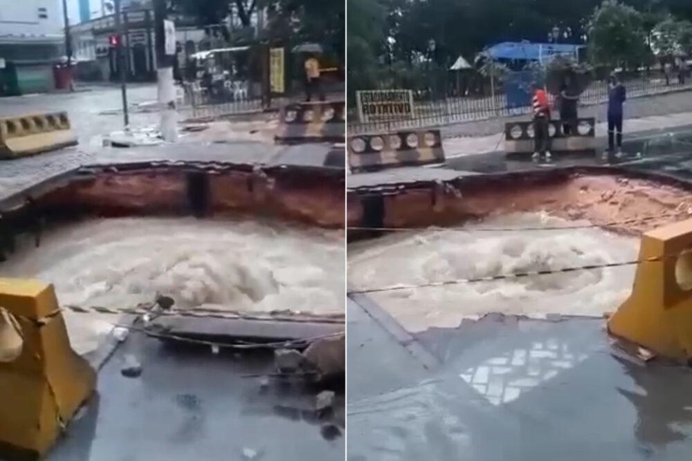 O buraco abriu na última quinta-feira (14), após um trecho da antiga Galeria dos Ingleses ceder devido a tubulação que passar no local romper. Porém, o vídeo mostra o buraco bem maior e água quase transbordando. A via está interditada, porém o local está perigoso. Em nota, a Prefeitura disse que o trabalho será solucionado a médio prazo, pois o nível das águas está, hoje, com 28,1 metros de altura, impossibilitando temporariamente o serviço.
